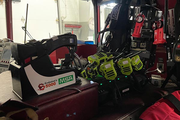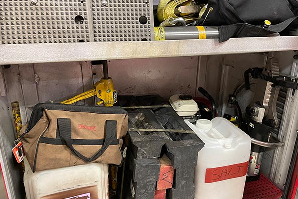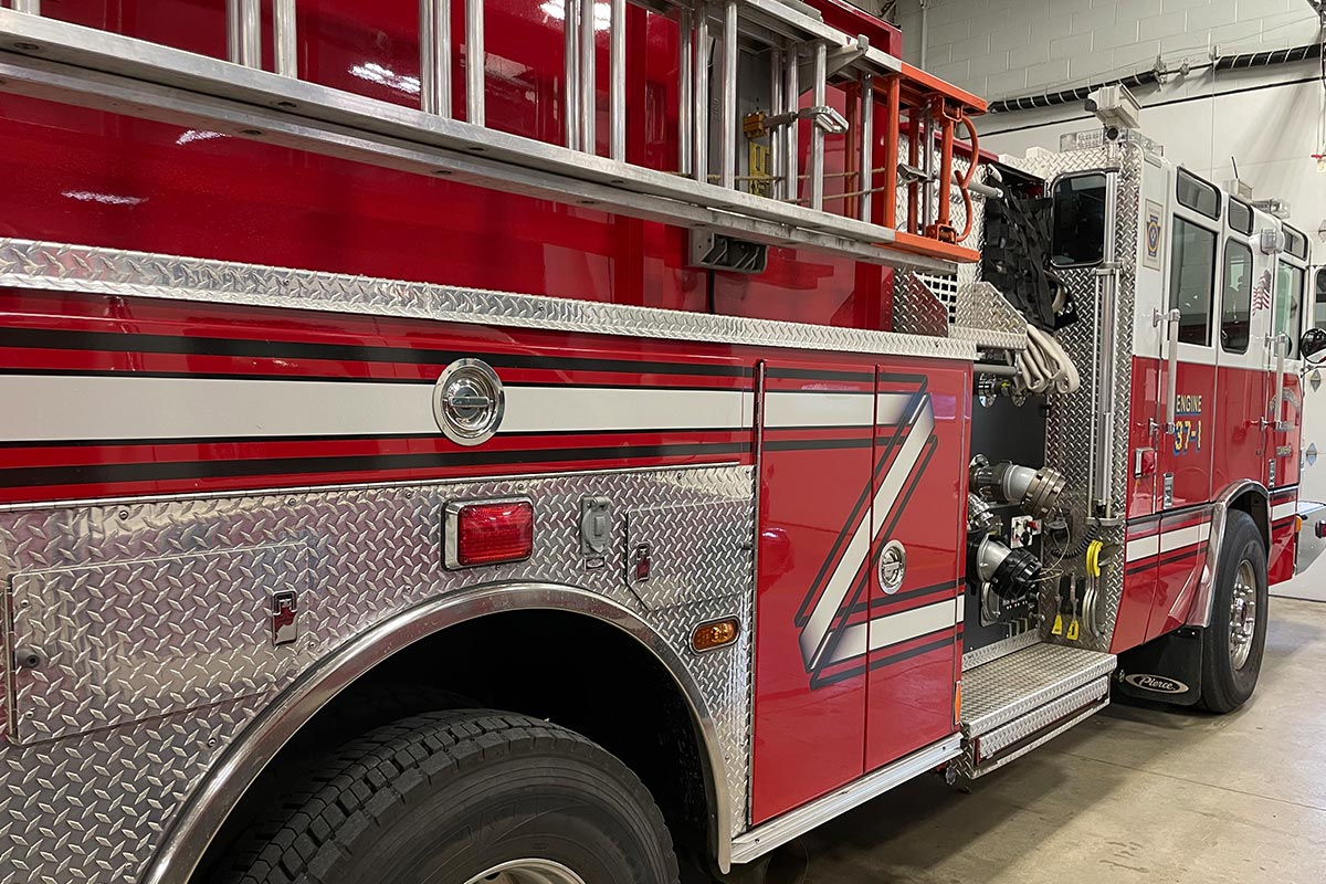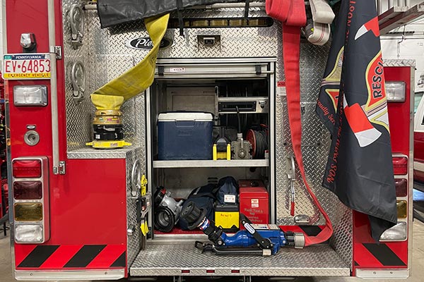 Engine 37-1 is a 2008 Pierce Quantum with a 1500 gal./min pump and 1000 gal. tank. It carries 1800′ of 5″ supply line, 4 pre-connected 200′ attack lines with TaskForce automatic nozzles, and a 150′ trash line on the bumper. Its ladder compliment includes a 28′ extension ladder, 14′ roof ladder, and attic ladder. To support Rescue Fire Company’s core function of a rescue unit, Engine 37-1 carries a portable hydraulic pump, combo tool, basic cribbing, struts, and crash kit. Engine 37-1 is also outfitted with medical equipment and AED for basic life support. This engine seats 8 fire fighters, with 5 seats having SCBAs.