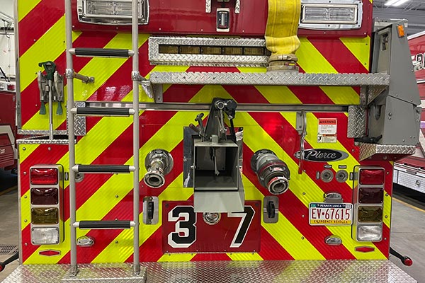 Tanker 37 is a 2011 Freightliner/Pierce ordered and purchased from Pierce manufacturing. The tanker is capable of carrying 2000 gallons of water and has a 500 gpm PTO driven pump. The hose bed consists of 1000′ of 3″ supply line and 200ft. of 5″ supply line. There are two crosslays situated overtop of the pump pannel each 200′ in length with TFT nozzles on each. Additional carried equipment: adaptors and appliances, low level strainer, set of irons, brush rakes, 2-4′ pike poles, foam eductor, 25 gallons of foam, 2100 gallon fold-da-tank, floating pump, and forrestry hose.
